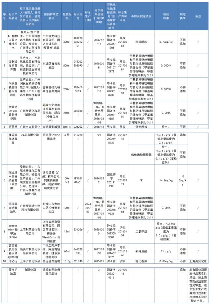 不符合要求的项目包括:丙烯酰胺、甲基氯异唑啉酮、甲基异硫唑啉酮、氯化镁和硝酸镁的混合物、倍他米松、倍他米松醋酸酯、苯、二氯甲烷、新铃兰醛和特比萘芬。