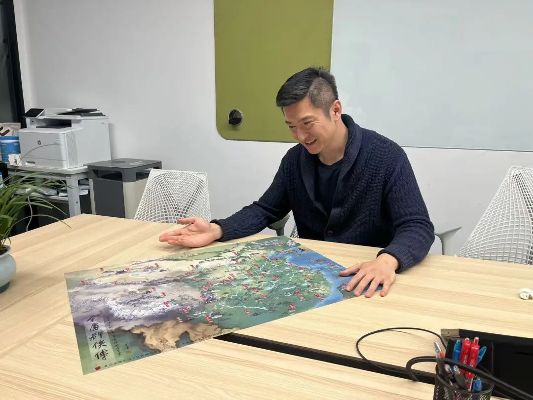 在对话现场,吕程拿出一张中国地图,上面全是金庸书中的代表人物。吕程说:“终端武侠游戏每年有20亿美元的市场,其中《逆水行舟》等四款游戏占90%,但这些游戏正处于人生的后半段。如果我们持有的IP占据了四分之一的市场,每年就有五六亿美元的收入。”
