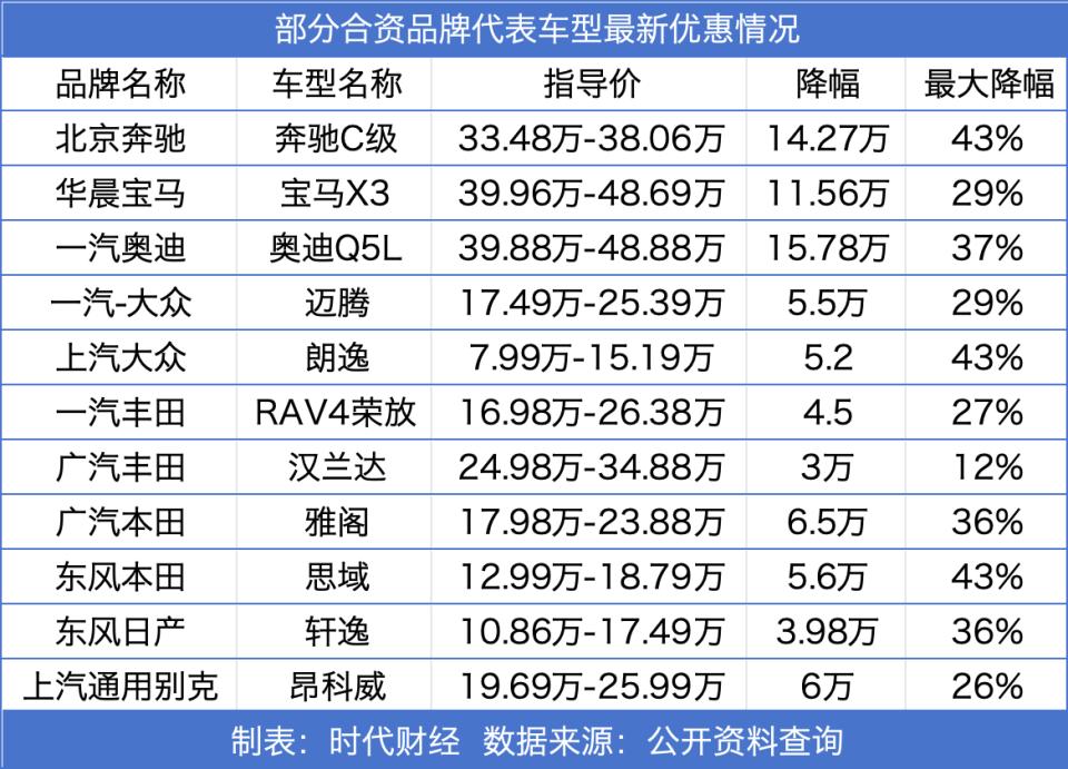 根据时代财经统计,月销量过万的热门合资车型,优惠力度一般在20%以上,最高43%。