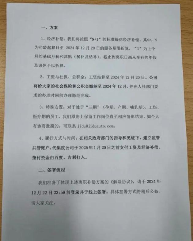 4、实施方式及时间:在有关政府部门的指导和见证下,建立管控共管账户,代集度公司在有关政府部门的指导和见证下, 2025 年 1 月 20 前几天支付工资和经济补偿,预付款由百度、吉利支付。
