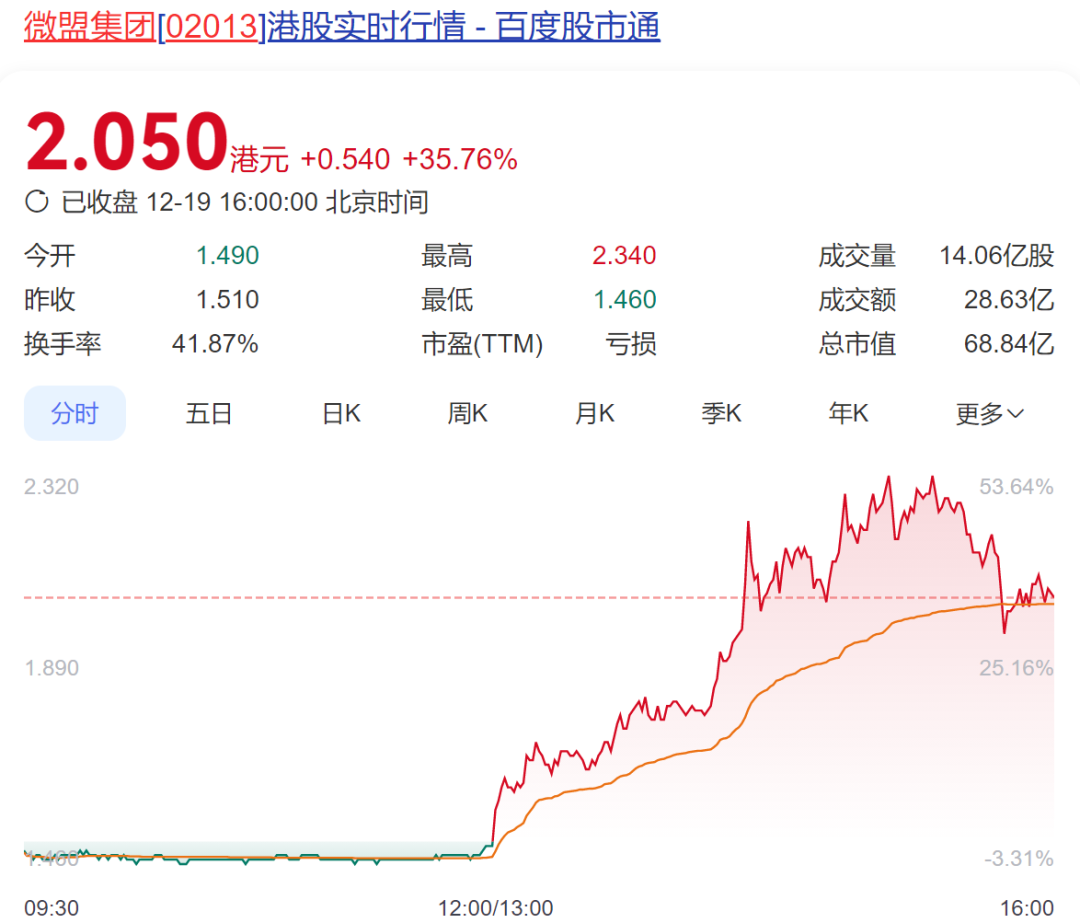 十二月十九日,微盟集团(HK02013)下午股价一度上涨50%以上,最终收盘价为2.05港元/股,上涨35.76%,引起业界关注。