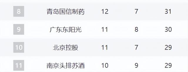 8-11 分别是青岛、广东、北京和同曦。在青岛遭遇伤病潮时,他们仍能取得三连胜,这是令人欣慰的。最近广东已经回暖,但是主力球员继续被杀,他们的压力是巨大的。目前北控三连胜,也止住了颓势,可惜结局要和浙江对战。目前同曦已经连续输掉了两场比赛,球队的化学变化越来越差,也在落后,离前面的球队很远。 2 个胜场。