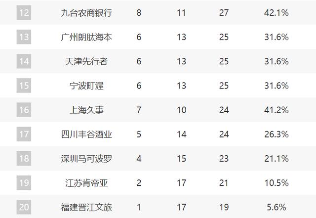12-20 吉林、广州、天津、宁波、上海、四川、深圳、江苏、福建。现在上海已经连续六场胜利,他们已经接近第一名。 12 名字。而且如果同曦下滑,也许其他球队会和同曦竞争第一名。 12 位置。根据目前的趋势,上海有望在月底来到季后赛。对于吉林、同曦、广州、天津来说,他们四支球队将是最终的名额竞争对手。