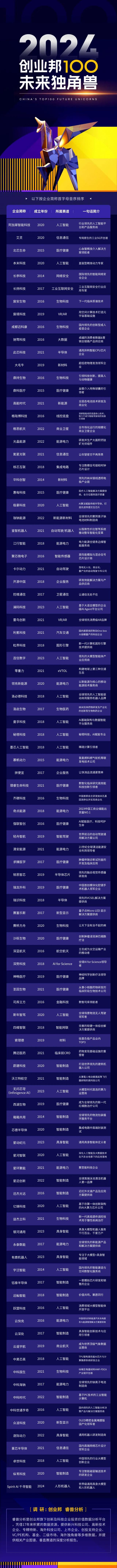 这次比赛持续了六个月,吸引了很多公司的积极参与和投资机构的积极推荐。接近 300 在申报企业中,根据资本价值、增长速度、市场前景等关键指标,专业审查团队进行了严格的数据核查、深入的研究和调查采访,最终选出。 " 2024 创业邦 100 未来独角兽"。