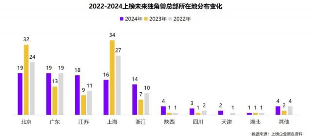 与往年相比,今年上市公司的分布不再是“北上”的趋势,整体分布更加均匀,集中在广东、北京、江苏、上海、浙江。其中与 2023 2008年,沿海省份上市公司数量明显增加,其中江苏、浙江上市公司数量翻了一番,广东再次回归 2022 年份比例,与北京并排成为今年上市公司分布最多的省份。除了 除了“头部经济科技创新先锋区”,未来中西部地区独角兽企业也将开始崛起,其中四川和陕西共有。 7 一家公司上榜,正成为未来独角兽新企业孵化的地方。