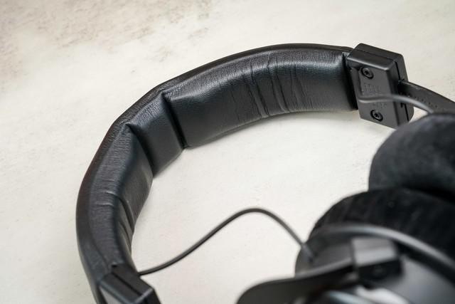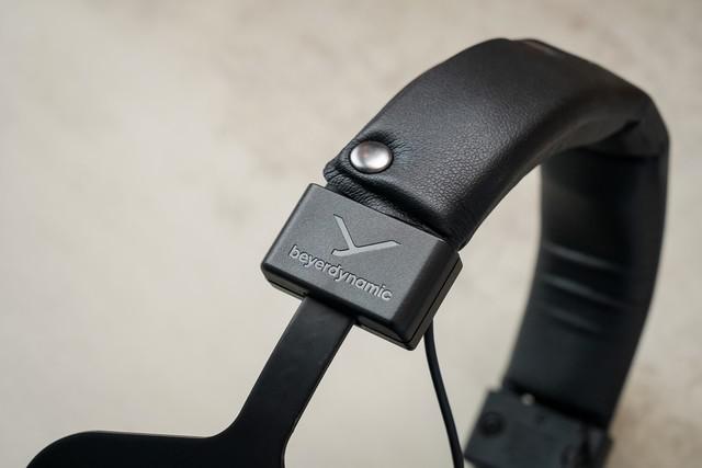 拜雅 MMX300PRO 采用经典的一体式头梁方案,外面印着拜雅英文 logo,可以看到它采用了 4 枚子母扣,采用可拆卸的皮革包装方案,方便用户更换和维护,同时也为整个耳机增添了不少原始的高级感。