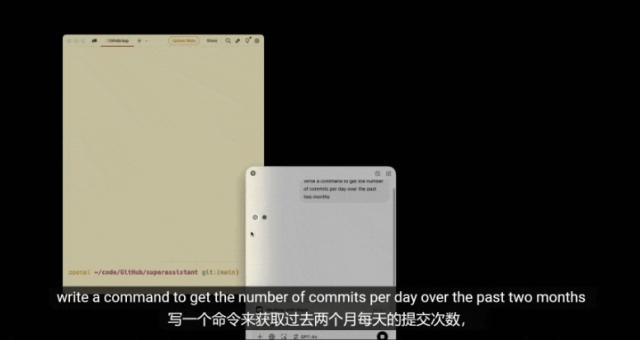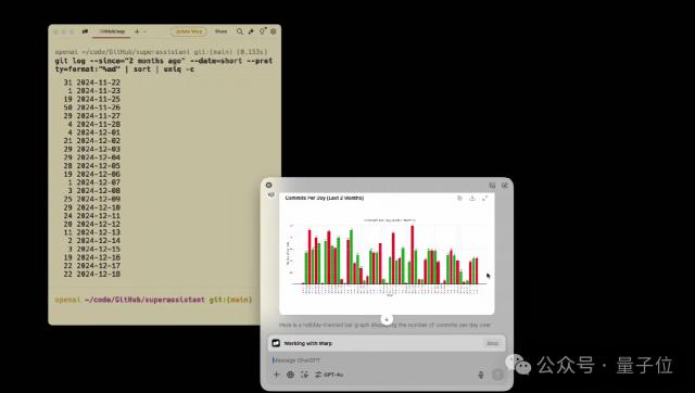 现场演示阶段,一个小哥哥用了。 Warp 连接到 GitHub,并要求 ChatGPT 对过去两个月的日常提交进行统计。