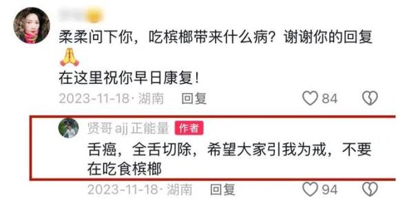 湖南抗癌网红贤哥今年九月不幸因舌癌去世,年仅36岁。在治疗过程中,他非常喜欢嚼槟榔,四分之三的舌头被切除。