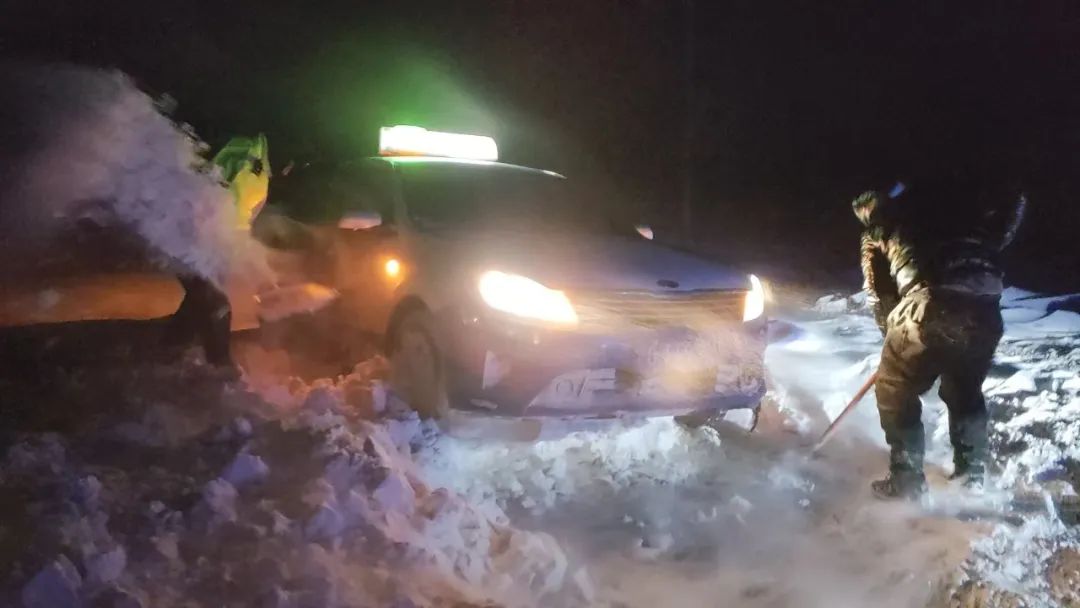 2024年12月19日凌晨1时许,阿合别斗派出所接到指令,称X827线5公里处有4辆车被困在雪地里,需要立即前往救援。警方立即联系955应急救援队,赶到现场联合救援。