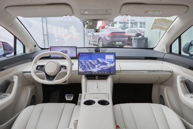 内部部分,智界 R7 持续智界的增程版 R7 纯电动车型设计,采用游艇式环抱座舱布局,配有弧形矩形方向盘,悬浮式中控屏幕 / 仪表板等,并配有手机无线充电面板在中控屏下方。