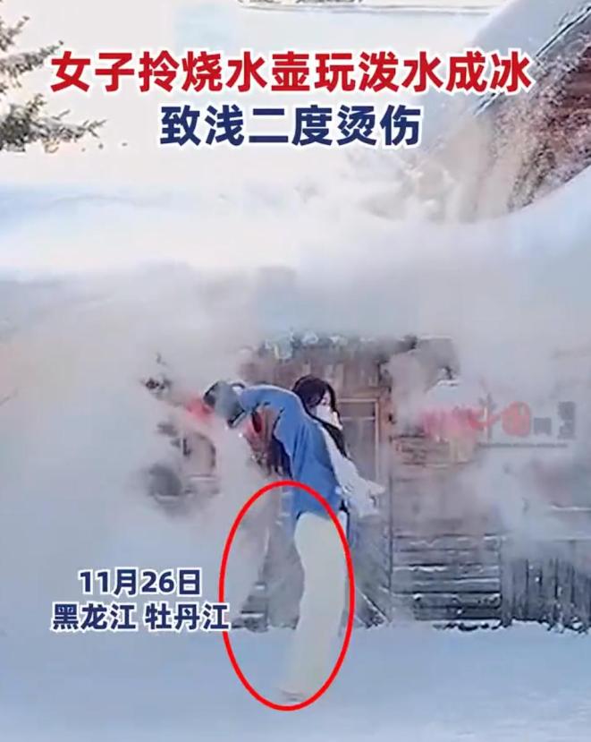 江女士说,她以前在网上看到过“泼水变成冰”的场景。只要热水泼在极寒天气里,水就会在空中迅速凝结成冰。她决定自己试试。然而,由于她的错误操作,热水升起的弧线不仅没有瞬间变成冰,还浇在头上造成烫伤。