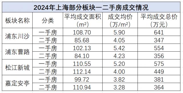 在松江新城和嘉定安亭两个板块,二手房的平均交易面积受到一些大平面和重叠别墅项目的影响,但比新房大。