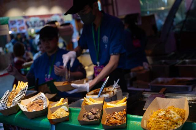 11 月 24 一天,工作人员在第24届澳门美食节做饭。新华社(张金加摄)
