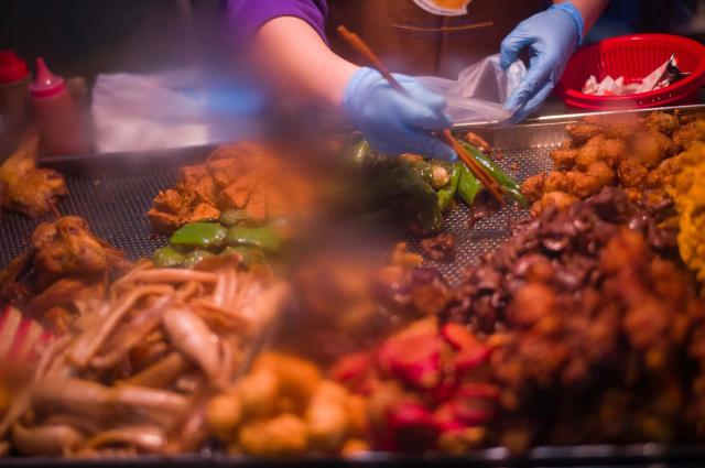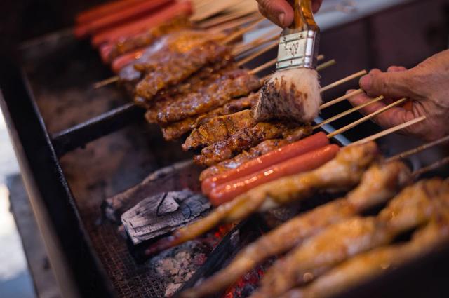 12 月 8 日本,金记烤串位于澳门基地大街上,员工正在烤串。新华社(张金加摄)