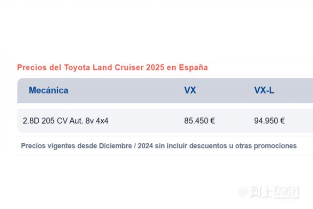 目前丰田 2025 一款普拉多车型已经在海外市场上市销售,新车共推出两款车型,市场起售价为: 85,450 欧(约为 65 万元)。与此同时,新车也推出了一款全新的“ VX-L “系列车型供消费者选购,并取代之前销售的“首发版”车型,其配置也将大大提升。