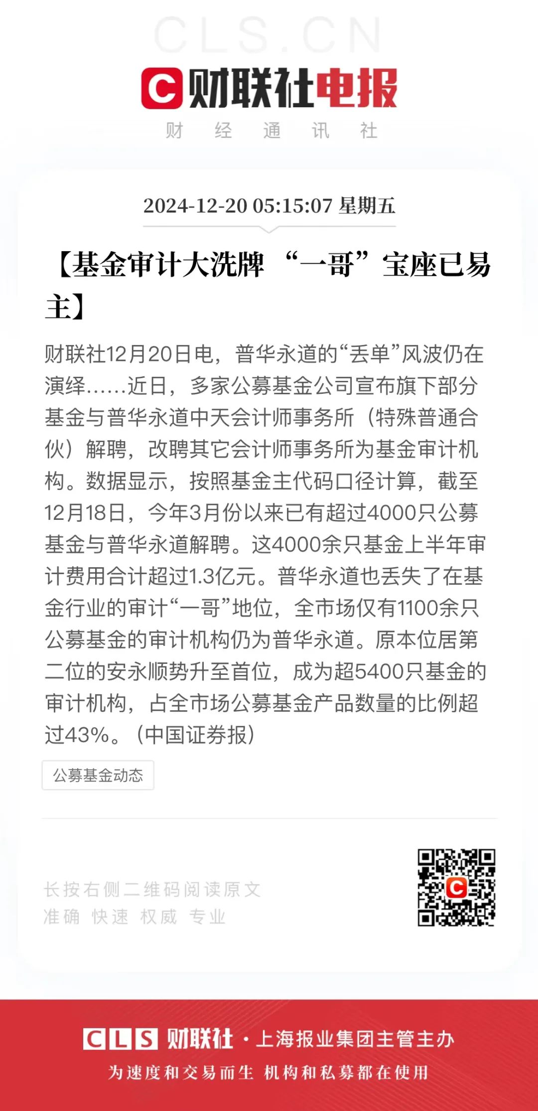 数据显示,截至12月18日,截至今年3月,已有4000多只公募基金和普华永道解雇。上半年,这4000多只基金的审计费用总额超过1.3亿元。在基金行业,普华永道也失去了审计“一哥”的地位,全市只有1100多家公募基金的审计公司仍然是普华永道。原本排名第二的安永顺势升至第一,成为5400多只基金的审计公司,占全市公募基金产品数量的43%以上。 (中国证券报)