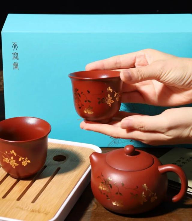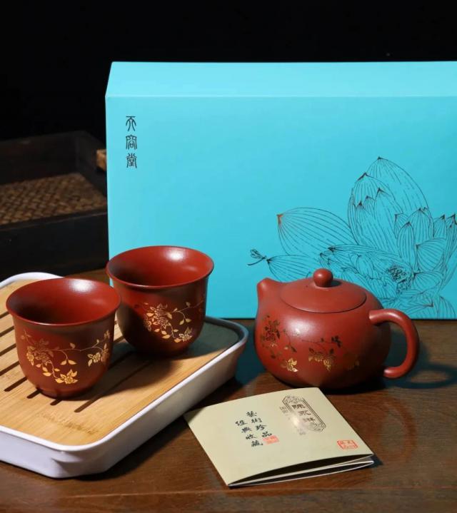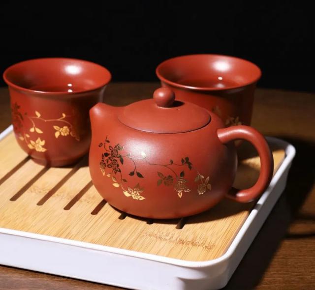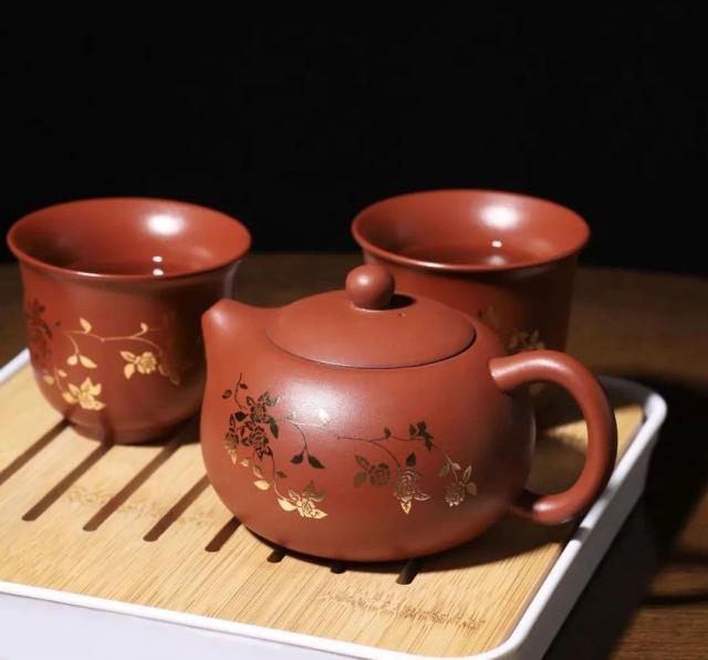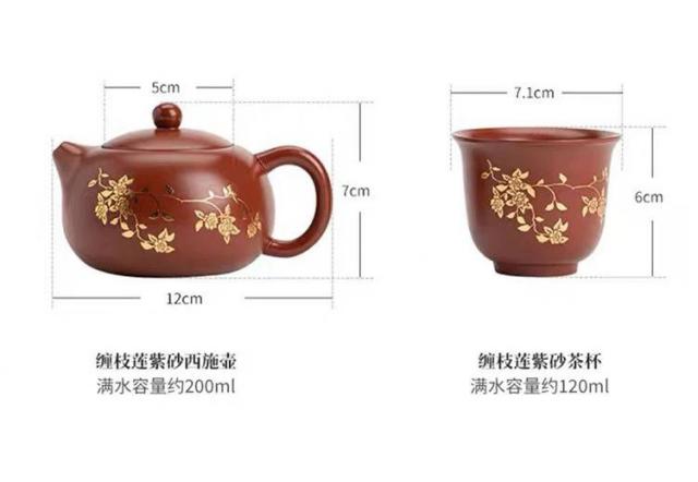 今日带给大家的这款。——【一壶两杯套装紫砂缠枝莲贴花】