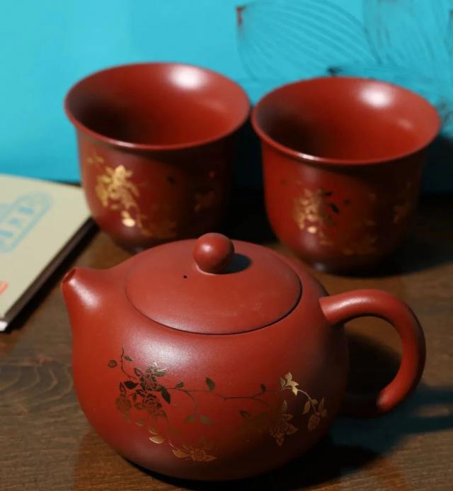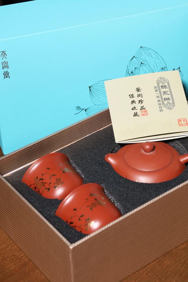 这套【紫砂缠枝莲贴花一壶两杯套组】由陈永琳大师制作!
