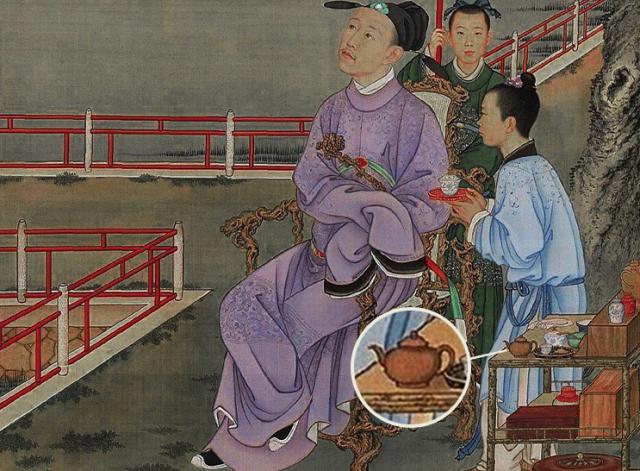 放在茶柜上的《乾隆行乐图》中,有一把紫砂朱泥小壶,茶壶应该受到乾隆的青睐。