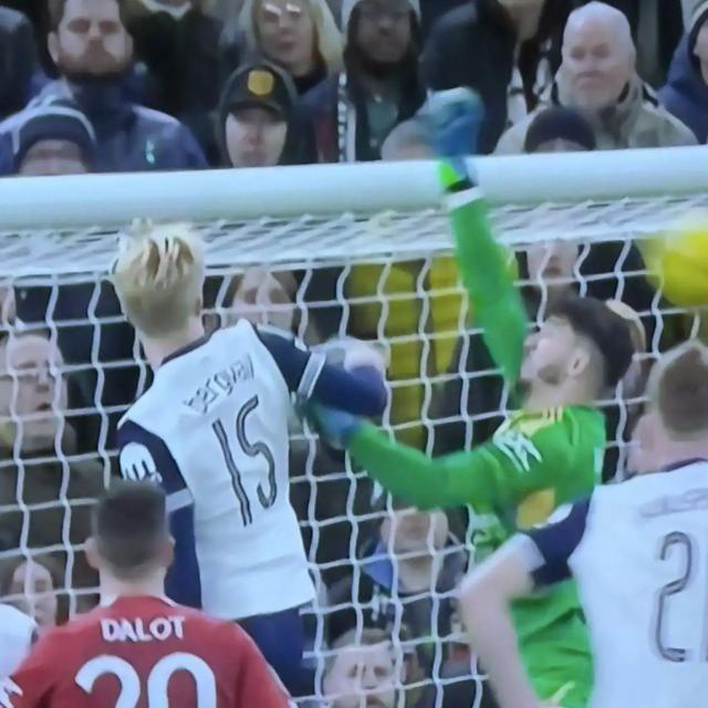不幸的是,在第 88 几分钟后,球场上出现了一个有争议的场景。热刺队长孙兴邈给出了左路角球,巴因迪尔没能触球,足球直接进入网络,曼联 2-4 希望不大。慢镜显示,热刺 18 年轻的卢卡斯 · 在贝里瓦尔跳起来之后,他的手臂挡住了曼联门将的左手,这个球被怀疑影响了守门员。