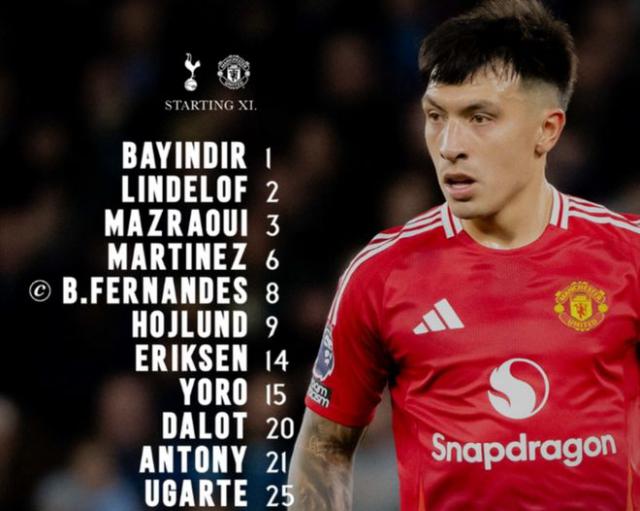 曼联首发:1- 巴因迪尔、2- 林德洛夫、15- 约罗、6- 利桑德罗 - 马丁内斯、3- 马兹拉维、25- 乌加特、8-B 费、14- 埃里克森、20- 达洛特、21- 安东尼、9- 霍伊伦