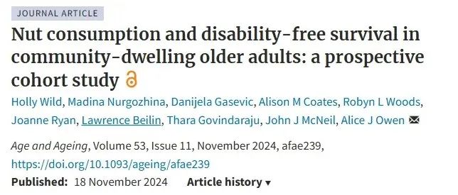2024年11月18日,《Age and Ageing》一项来自澳大利亚莫纳什大学的研究在期刊上发表。该研究主要针对9916名无痴呆症、心脑血管疾病或重大残疾老年人的ASPREE纵向研究,主要分析他们的坚果摄入情况。