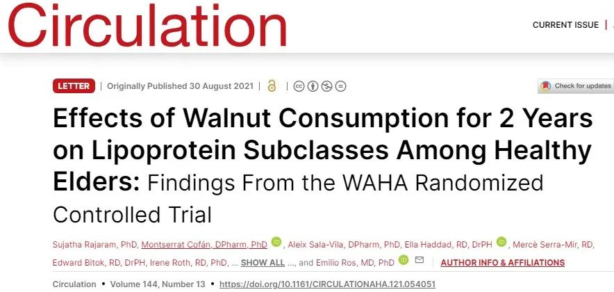 《循环》杂志2021年的一项研究发现,健康老年人在两年内每天食用30-60g核桃,有助于降低坏胆固醇水平,提高低密度脂蛋白颗粒的质量,从而降低动脉硬化和心血管疾病的风险。