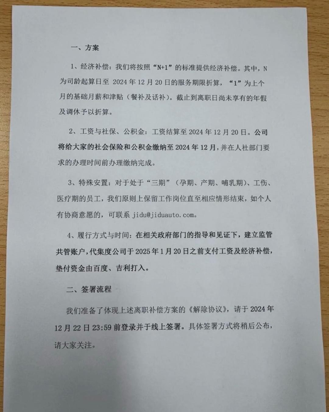 12 月 19 2008年,网上曝光了一份极限员工善后计划文件的照片。该文件显示,在相关政府部门的指导和见证下,已建立了一个控制共管账户,该账户将代极越为员工支付相关费用,预付款由百度和吉利支付。