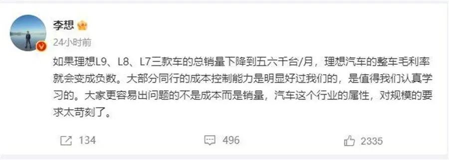 2023年5月,理想汽车CEO李想发文感叹:“汽车行业的特点,对规模的要求过于严格。”