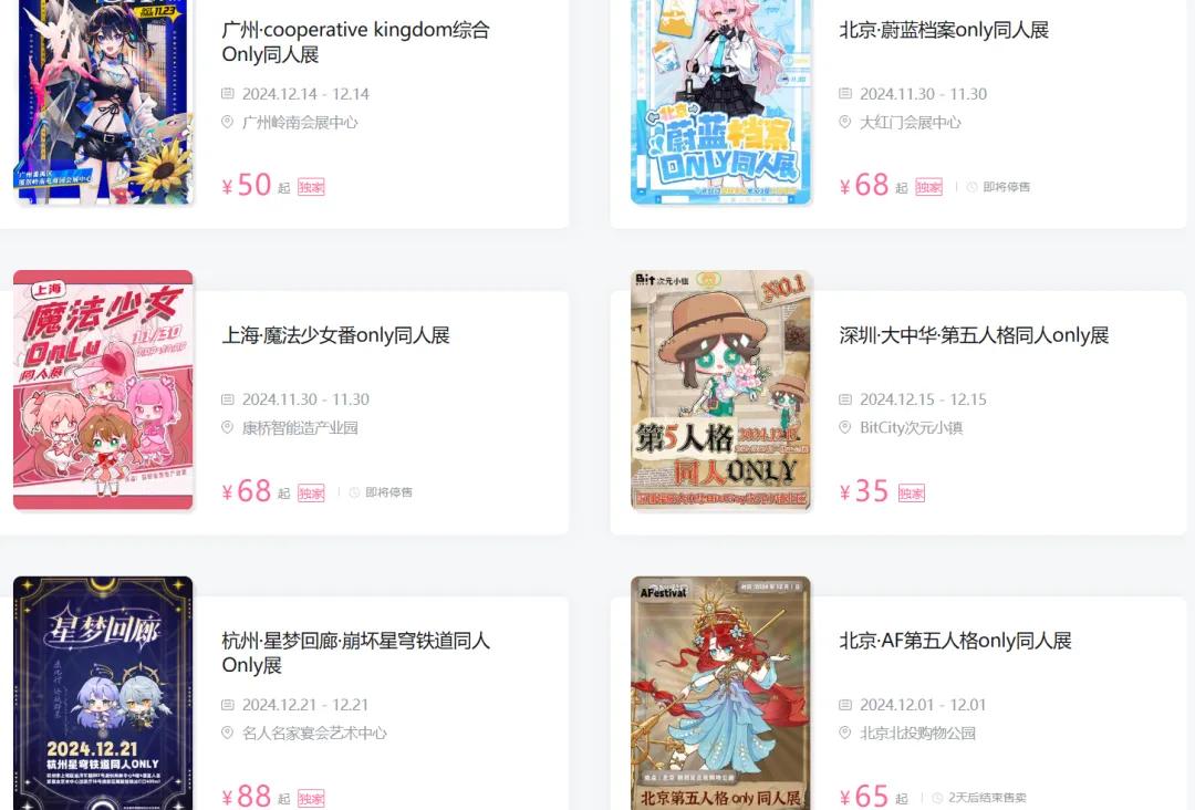 以我自己为例。虽然是二次元,但是很少去Only展览。我会去大型商业展览,综合ACG展览,CD、CP等粉丝展览,以及游戏厂商举办的大型线下主题展览。然而,我对小型Only展览知之甚少,所以我找到了一个喜欢参加Only展览的老朋友来引导我。