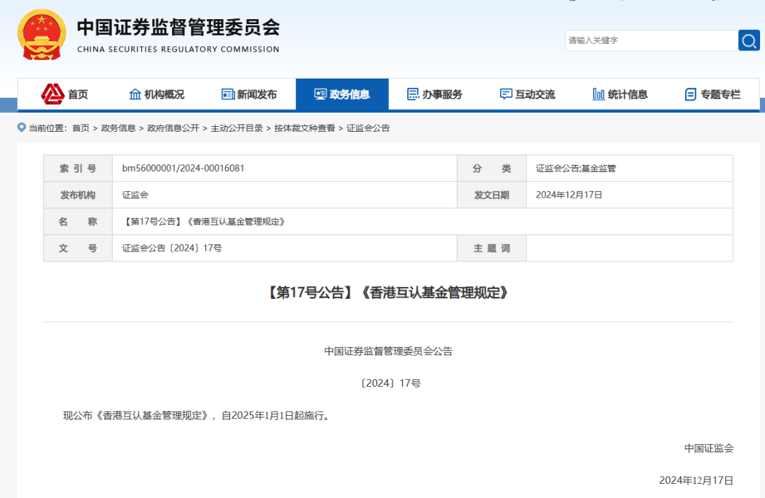 中国证监会官网12月20日发布消息,修订发布《香港互认基金管理规范》(以下简称《管理规定》),自2025年1月1日起实施。
