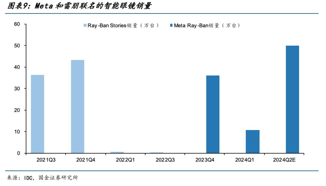 今年四月配备了AI功能,Ray-Ban 根据IDC的调查,2023年Q4和2024年Q14年Q1年的销售额有了突破。 ,Ray-Ban 根据国金证券的估计,Meta的出货量分别为36万台和10万台; Meta Ray-Ban出货量可达50万台,年化销售额可达200万台。