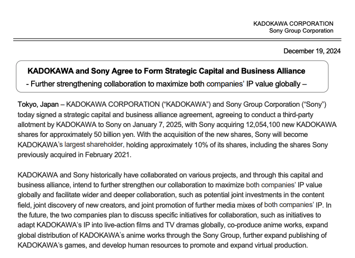 日本角川集团本地时间周四(Kadokawa)、索尼宣布达成股权收购和商业联盟协议。与此同时,双方宣布将在全球范围内开发、收购和运营各种IP产品。