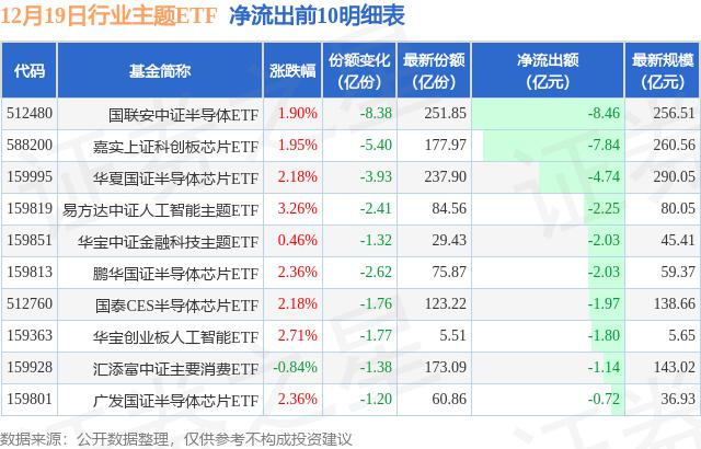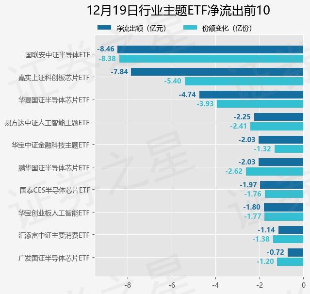 当天有 133 只行业主题 ETF 资金净流出,其中国联安中证半导体排名第一。 ETF(512480),份额下降 8.38 一亿份,净流出额为 8.46 亿元。