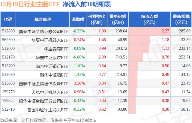 当天有 118 只行业主题 ETF 资金净流入出现,其中国泰中证全指证券公司净流入排名第一。 ETF(512880),份额增加 1.9 十亿份,净流入额为 2.27 亿元。