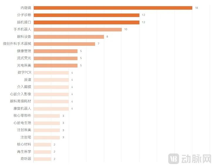 从行业角度来看,创新医疗器械分为医疗器械、高值耗材、体外诊断、上游供应链四大类。其中,内窥镜、手术机器人、脑机接口、光电医疗美容设备等细分领域的融资事件数量居前;高值耗材中心血管、眼科、医疗美容、微创外科融资事件排名第一;体外诊断领域的分子诊断平台(包括数字PCR)、肿瘤早期筛查,测序服务)、临床治疗开发及服务商,如气液相和质谱仪器、代谢组学、蛋白组学、空间组学等,以及上游、流式荧光在免疫领域的应用等融资事件比较频繁。另外,上游供应链跑道的兴起,影像设备的核心部件,CDMO、所有核心上游资料都知道融资。另外,上游供应链跑道的兴起,影像设备的核心部件,CDMO、了解融资的核心上游资料。值得注意的是,GLP-1的火爆推动了上游注射笔融资的火爆。