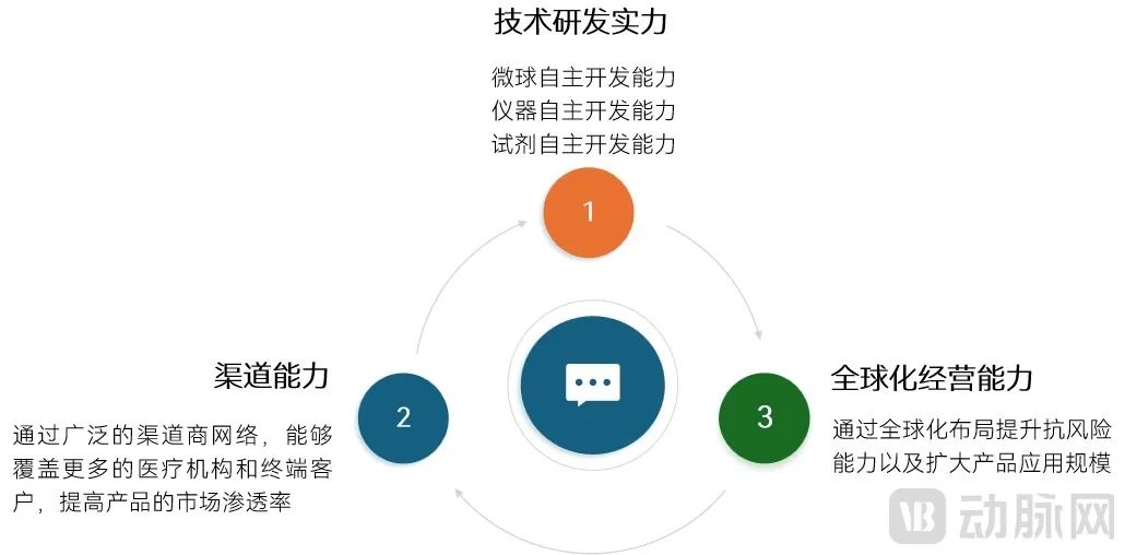 头部企业需要具备三个核心能力:一是技术研发实力是关键,公司必须掌握微球编码、多重试剂开发、光学检测、软件算法等关键技术,有利于企业形成商品核心竞争力,增加产品市场应用空间;其次,渠道能力尤为重要,体外诊断产品的商业化依赖于准确的市场定位和强大的渠道营销。为了实现商品的成交量;第三,全球化能力是拓宽流动荧光商品应用空间的关键,有利于应对单一市场变化的风险,需要根据国外市场特点开发适应的仪器和试剂。公司之间的竞争已经从单一技术的竞争转变为综合实力的竞争,出海逐渐成为一个试验场,渠道资源的积累、商业模式和优质产品成为一个重要的竞争因素。