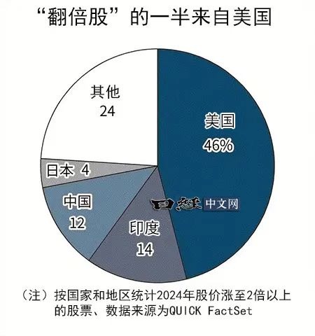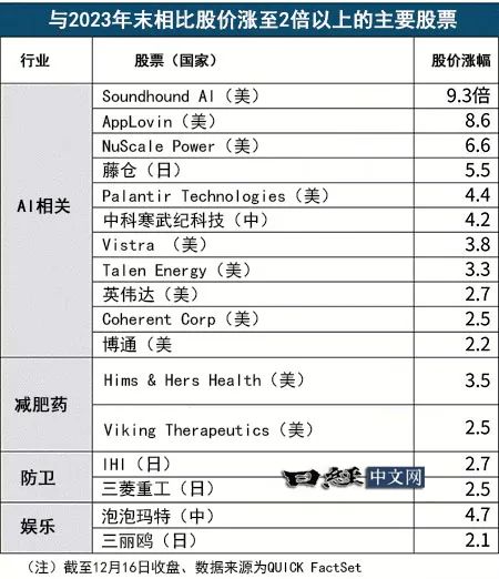 在全球股市中,2024年有118只“翻倍股”股价涨至2倍以上。生成式AI相关股票,如设备和电力基础设施,尤其明显。电线巨头藤仓(Fujikura)得益于AI带来的电力需求增加,股价飙升至5.5倍,成为唯一进入世界前十的日本公司。