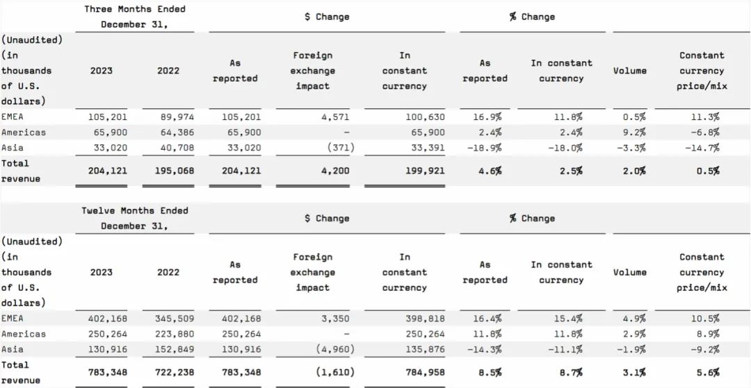然而,自2023年以来,Oatly在中国主导的亚洲市场一直处于低迷状态,多个季度实现了高收入和双位数的下降,纯利润持续亏损。Oatly亚洲地区2023年总收入为1.31亿美元,比去年同期的1.53亿美元下降了14.38%。在这些产品中,大中华区的利润从1.34亿美元下降到1.25亿美元,下降了6.72%,低于整个亚洲地区。