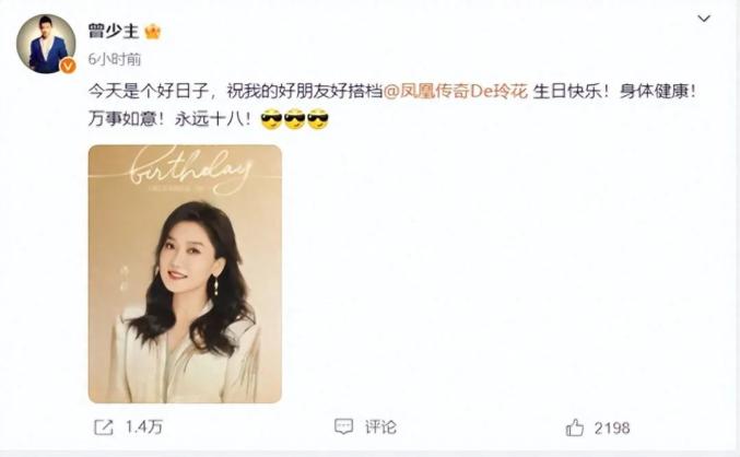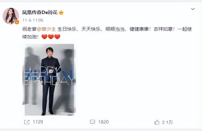 十二月二十日,“凤凰传奇”组合的曾毅发文:祝好友好伙伴玲花生日快乐,始终十八。