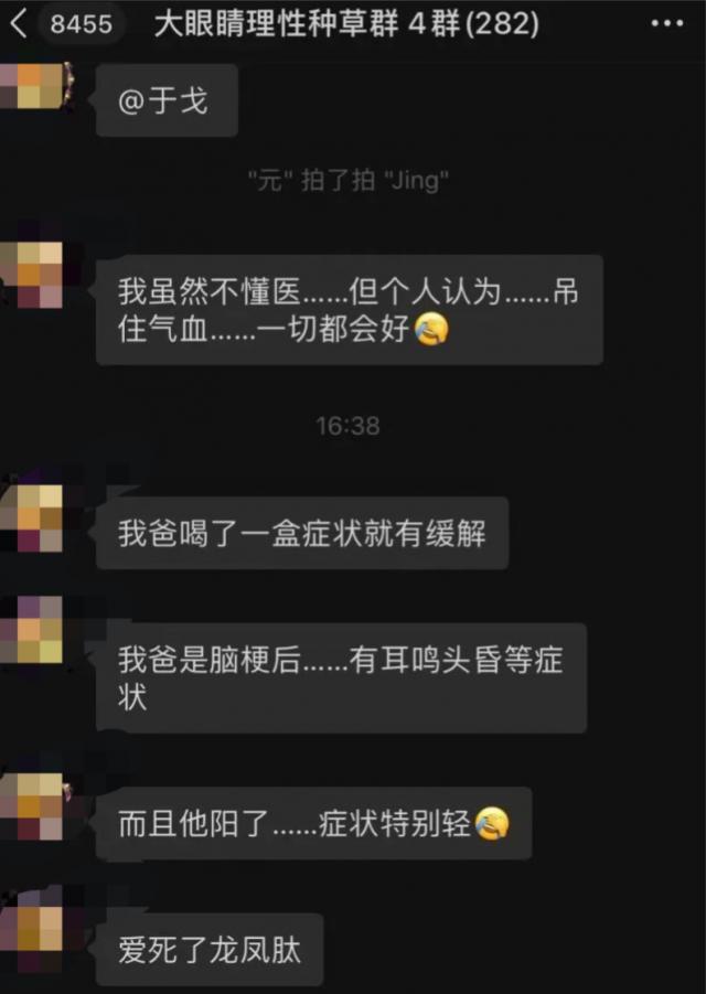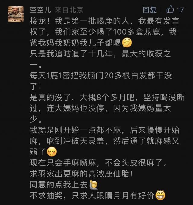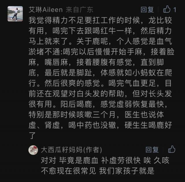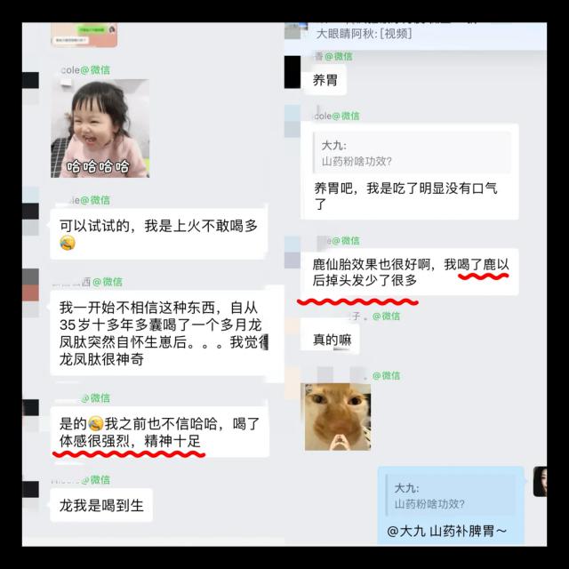甚至,在我们之前的头发打卡群里,还有老业主给新业主,自来水,种草龙,鹿,山药粉,@Nxxxx 老主人说,"龙会一直喝到生,喝完鹿觉得头发少了,精神饱满。� � "