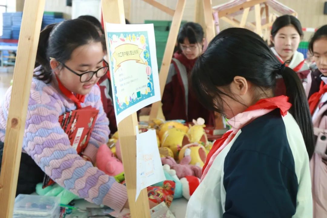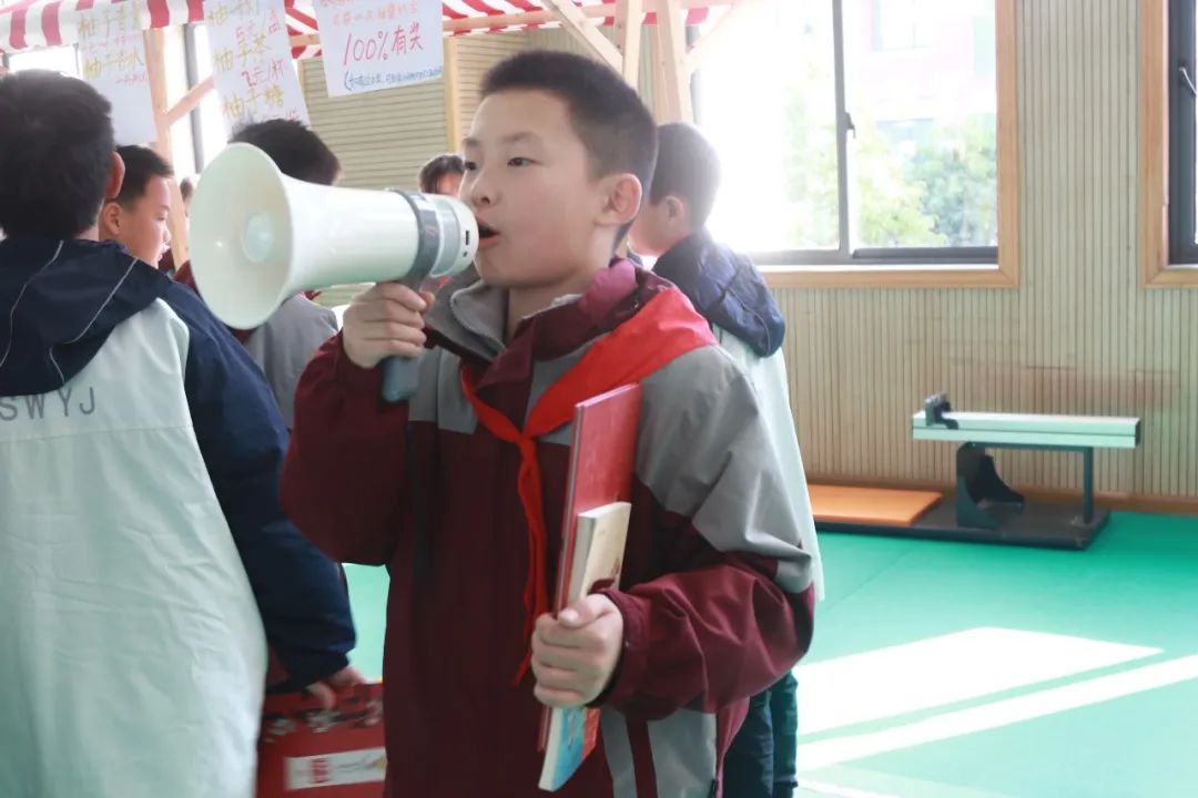 同一天,学校的室内体育馆变成了义卖市场。五年级的各个团队一个接一个地摆摊,叫卖声此起彼伏。一些摊主还找到了喇叭喊“元气柚子茶4元一杯”“柚子灯5元一盏”。五(5)班的同学们推出了六种柚子食品:柚子梨汁、元气柚子茶、柚子泡水、柚子“迷惑”蛋糕、柚子糖和柚子果冻,其中最畅销的应该是鲜榨柚子梨汁。