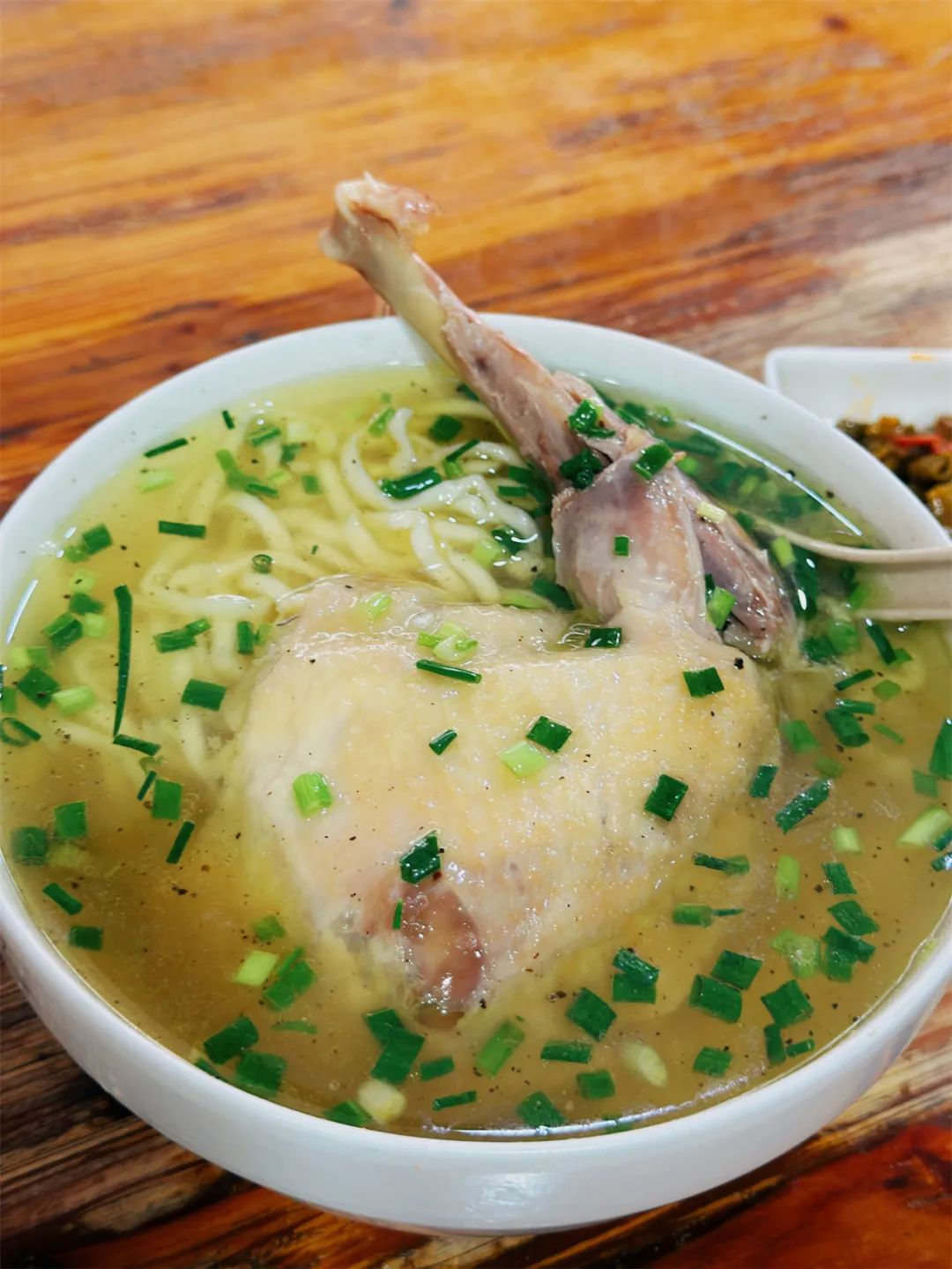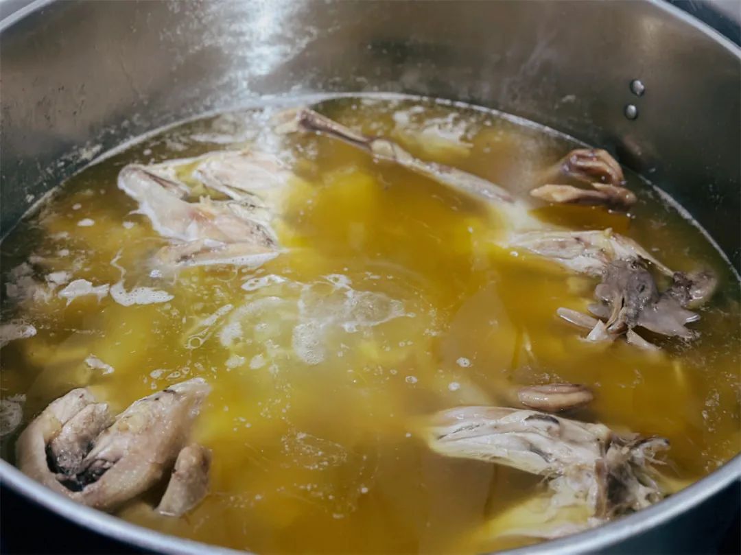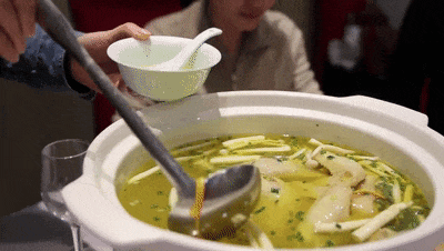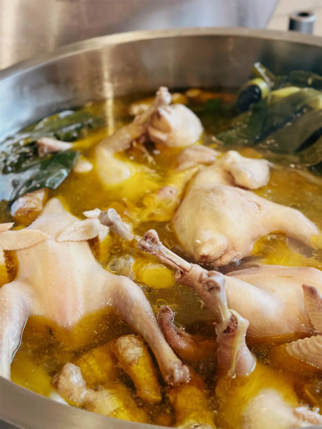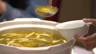 鸡汤顶上飘浮着黄亮亮的鸡油。