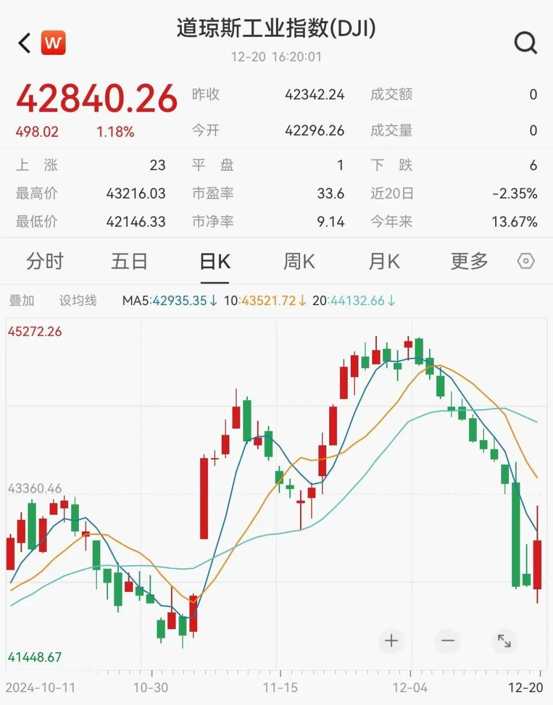 在周四的交易中,道琼斯指数勉强上涨了15点,结束了自1974年以来最长的10天下跌。道琼斯工业平均指数周三暴跌1100点,一天后小幅上涨。美联储之前暗示明年只降息两次,而不是第一次预测四次,这是股市暴跌的催化剂。