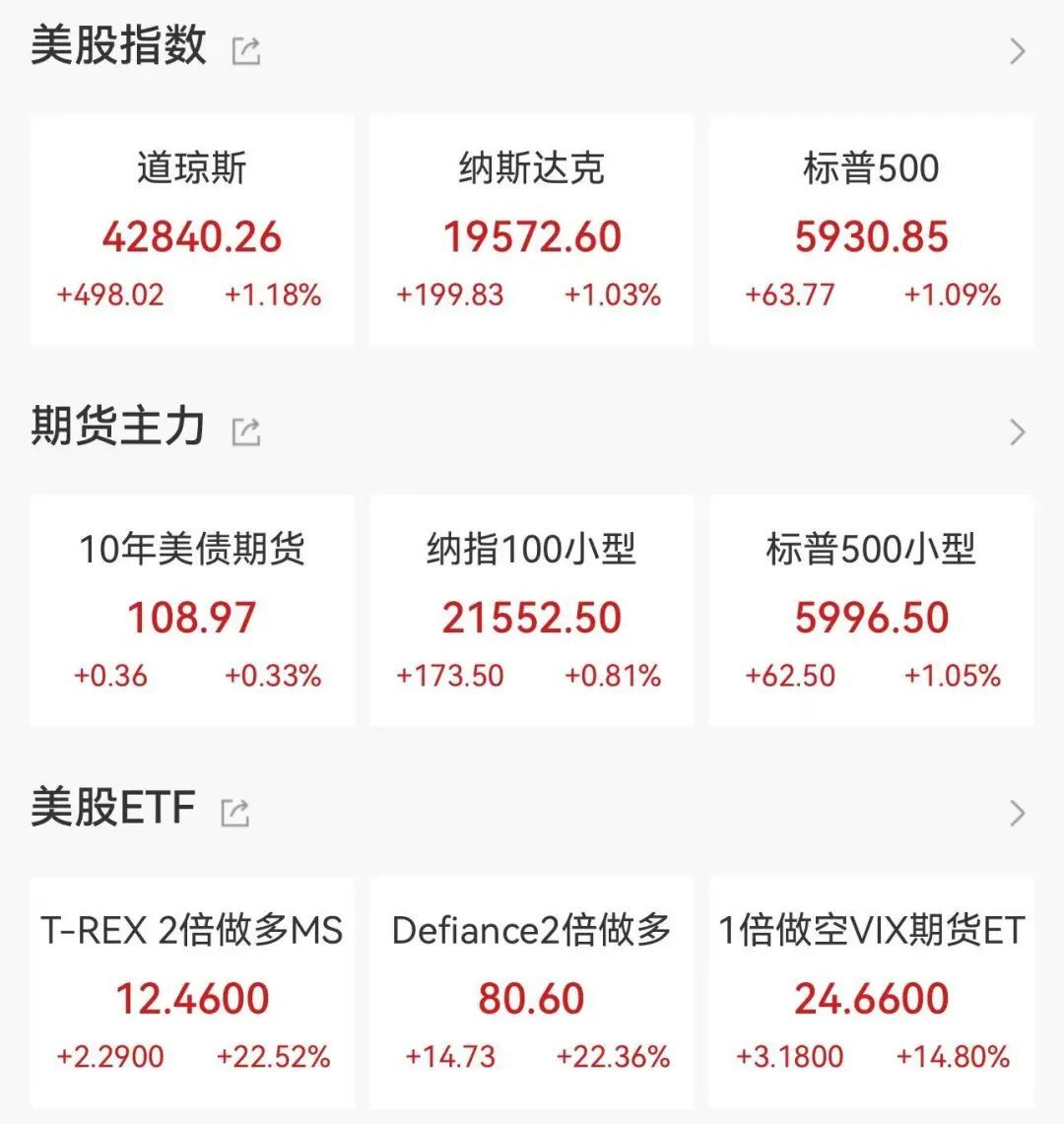 在42,840.26点之前,道指上涨了498.02点,上涨了1.18%。标准普尔500指数上涨1.09%,收于5,930.85点,纳斯达克综合指数上涨1.03%,收于19,572.60点。