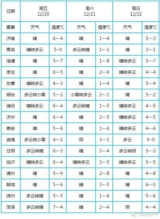 从20日晚到21日白天,烟台北部和威海的天气从中雪变成了多云,东营、潍坊北部、烟台南部和青岛北部的天气从小雪变成了多云,其他地区的天气变得更加晴朗。北风,半岛地区5~6级阵风7~8级,滨州,东营,潍坊,日照,内陆水面4级。~5级阵风6~7级减弱到3~4级,其他地区3级~4级。最低气温:鲁中山区-7℃左右,半岛地区-3℃左右,其他地区-5℃左右。最高气温:鲁中山区和半岛内陆地区-1℃左右,其他地区2℃左右。