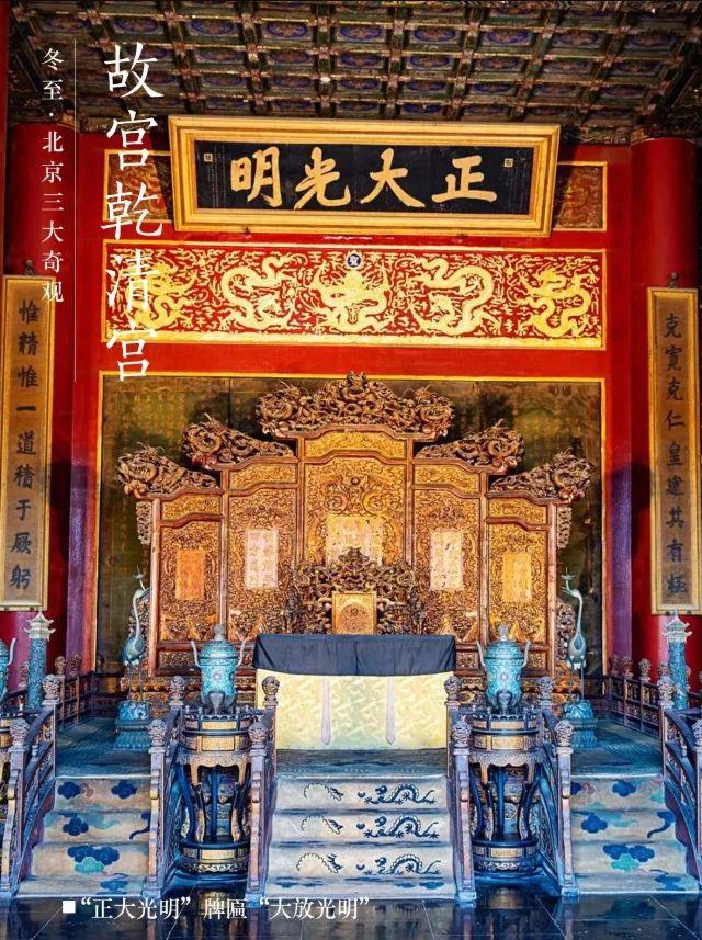 每年冬至前后的中午,太阳光照射在故宫乾清宫地面的金砖上,反射到“正大光”的匾额上。阳光依次由西向东照亮“正大光”匾额和下面的五条金龙,释放出金光。