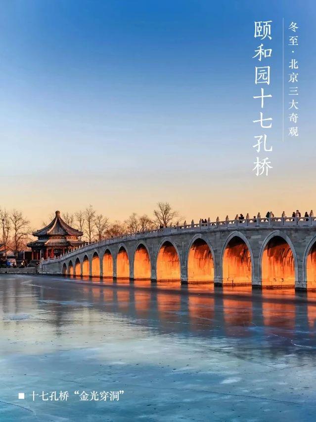 每年冬至前后,在阳光明媚的夜晚,十七孔桥都会被夕阳的余辉照亮,出现耀眼迷人的“金光穿洞”景观,成为网络名人中市民、游客和摄影师的打卡地。
