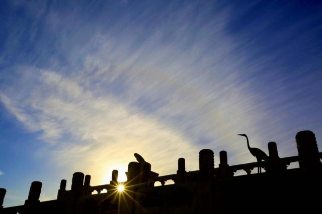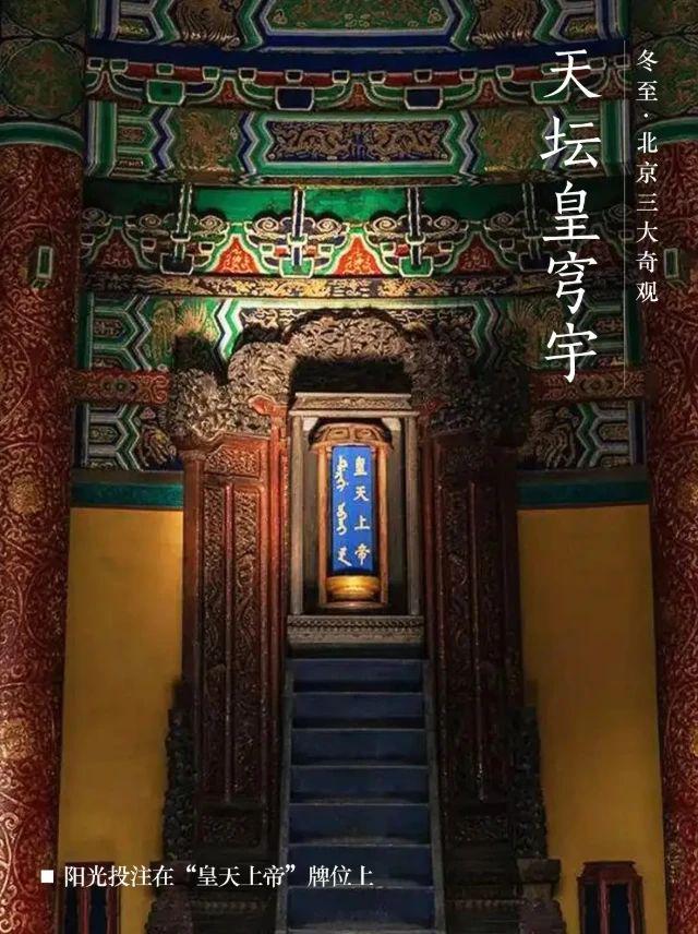 明清时期,每年冬至都会在天坛上举行盛大的祭祀仪式。皇穹位于丘陵北侧,原本是一个储存祭祀精神位置的仓库。然而,在冬至的中午,会有一束光穿过皇穹的正殿,像聚光灯一样照在正殿最深处的“天神”版本上,形成了“光神版”的冬至奇观,为古老而神圣的圣坛增添了许多神秘的色彩。
