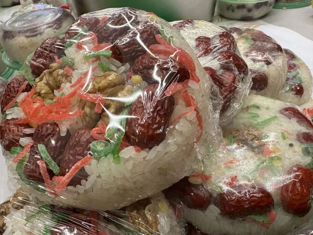 宋传新说:“红绿丝、蜜枣、核桃、糖冬瓜等材料都有,象征着恩爱、团团圆圆。”“做糯米的时候,我们并不像其他地方那样只放白糖和猪油,而是把松子炒香,拌到大米里去。”